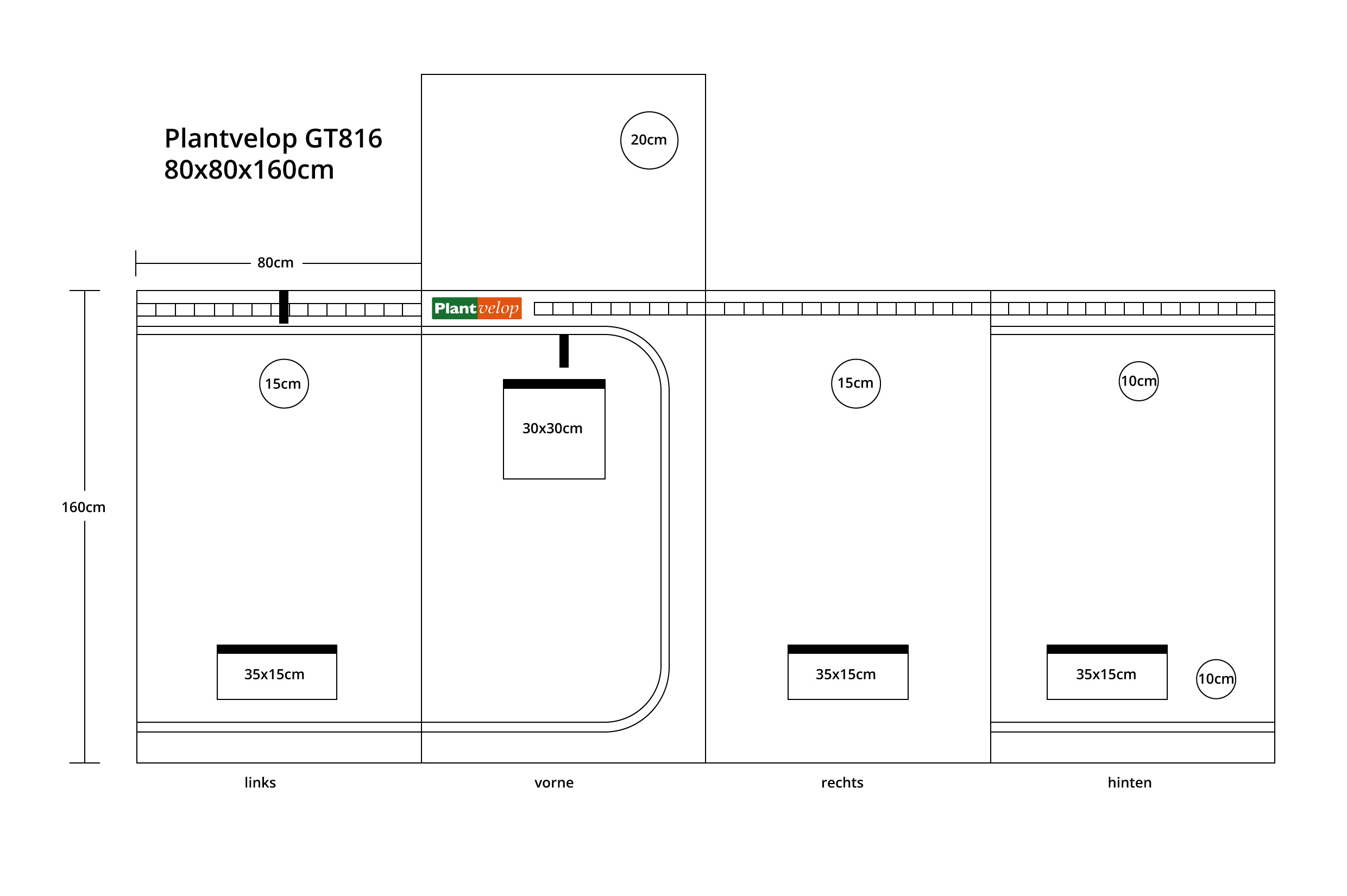 - Optimale Belüftung: Rohranschlüsse mit beidseitigen Einführungen – GT816: 1×20 cm, 2×15 cm, 2×10 cm.