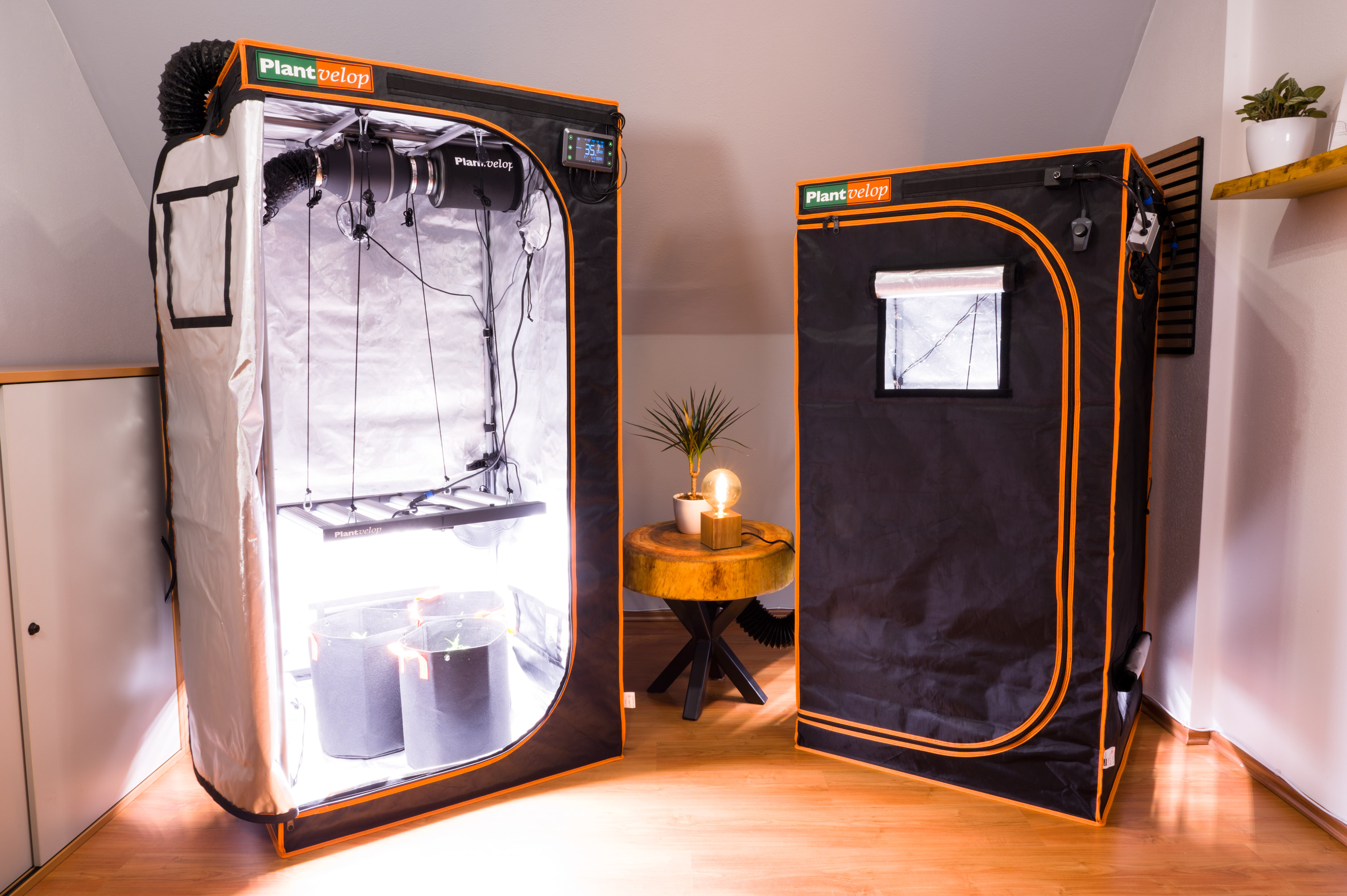 Die Plantvelop Anbauzelte besteht aus robustem Oxford 1680D Material mit wasserabweisender Oberfläche. Reflektierende Innenbeschichtung, präzise Nähte und stabile Industrie-Reißverschlüsse sorgen für Lichtdichtheit, Langlebigkeit und komfortablen Zugang von drei Seiten.