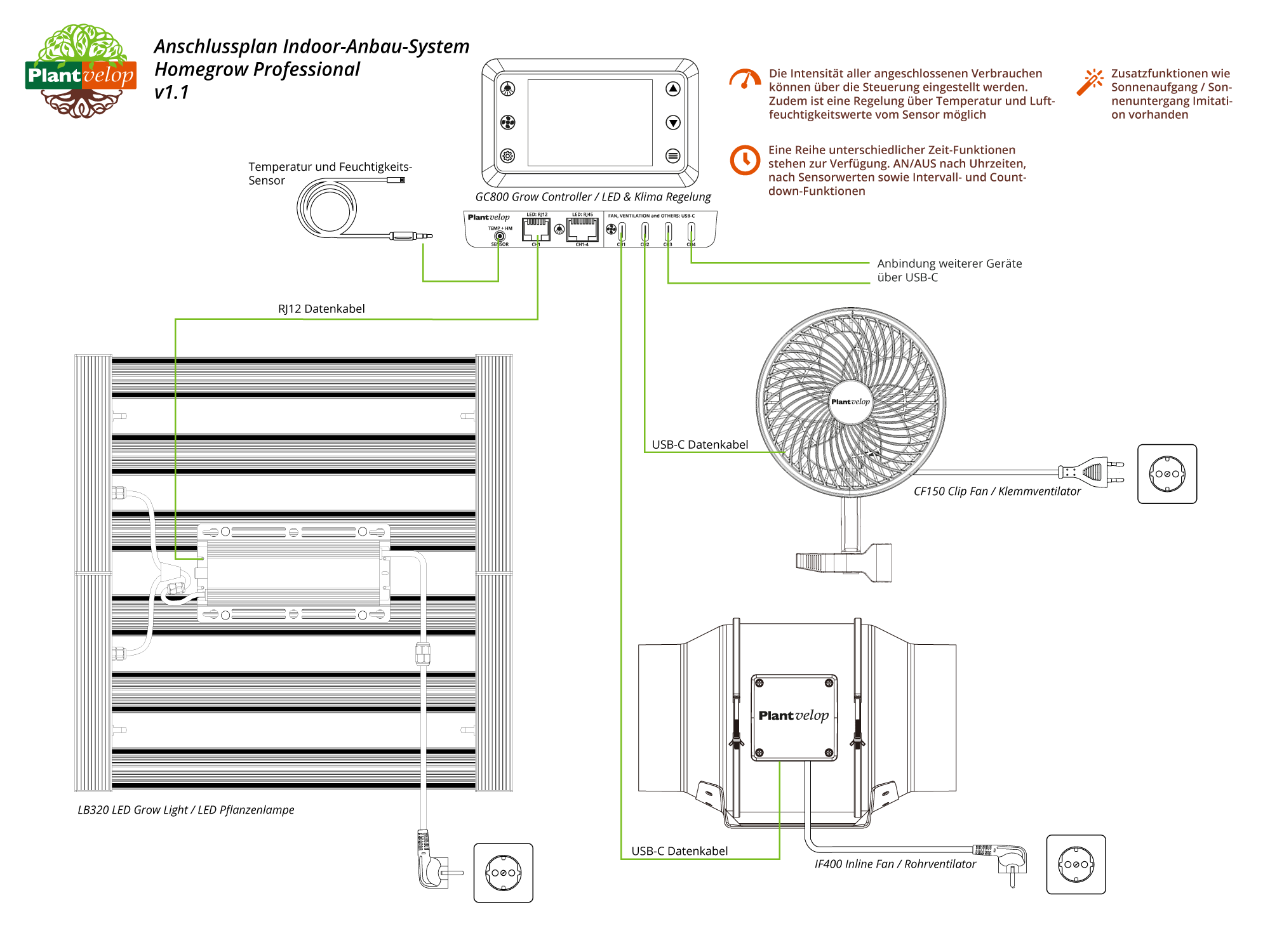 Der GC800 ist vollständig kompatibel mit allen Plantvelop-Komponenten, darunter die LED-Serie LB, der Rohrventilator IF400 sowie der Klemmventilator CF150.