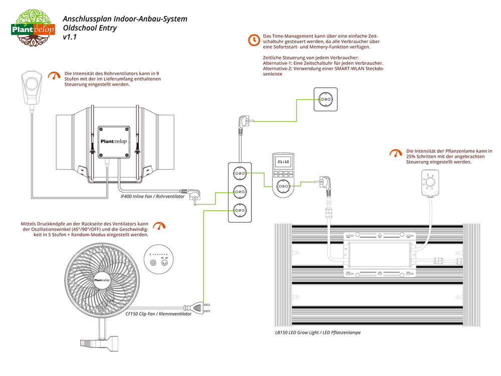 Diese übersichtliche Zeitschaltuhr ist kompatibel mit Plantvelop Komponenten, da diese über eine Sofortstart- und Memory-Funktion verfügen, Beispiel siehe Anschlussplan Oldschool Entry.